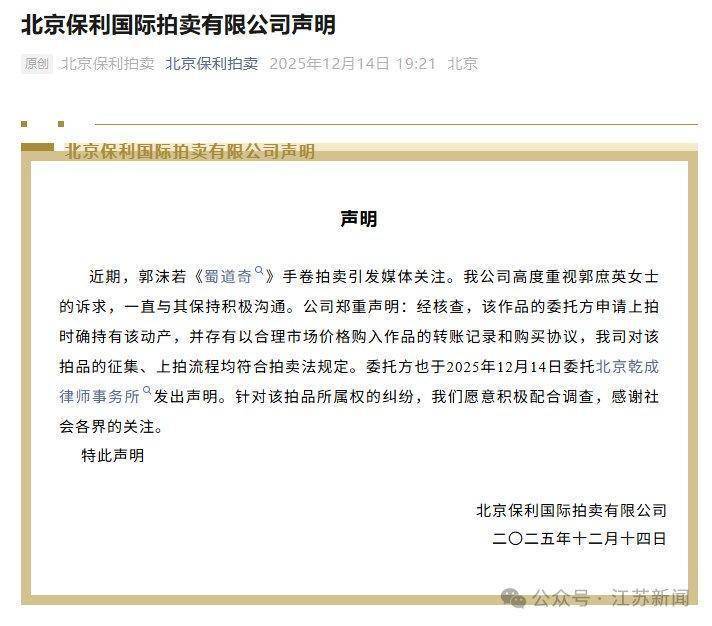 12月14日晚,针对郭沫若《蜀道奇》手卷拍卖一事,北京保利国际拍卖有限公司发布声明称,公司高度重视郭庶英女士的诉求,一直与其保持积极沟通。经核查,该作品的委托方申请上拍时确持有该动产,并存有以合理市场价格购入作品的转账记录和购买协议,公司对该拍品的征集、上拍流程均符合拍卖法规定。